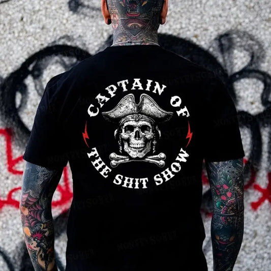 "Captain Of The Shit Show" T-Shirt - Skull Print Men's Tee, Funny & Casual Crewneck Top