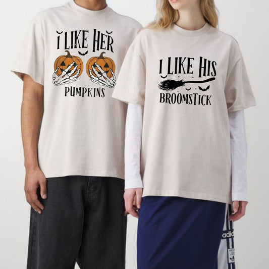 "I Like Her Pumpkins / I Like His Broomstick" T-Shirts - Funny Matching Couple Halloween Tees, Casual Spooky Style