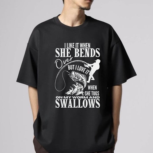 "I Like It When She Bends Over" T-Shirt - Fishing Dad Funny Fathers Day Tee, Humorous Angler Gift