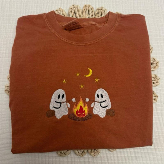 Haunted Campsite Embroidered Comfort Colors T-Shirt – Unique Halloween Ghost Tee