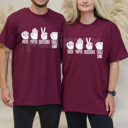 Rock Paper Scissors Table Saw Funny T-Shirt - Woodworker Humor Graphic Tee, Carpenter Safety Joke Shirt, Premium Heavyweight Unisex Woodshop Top, Funny Gift for Dad & Handymen, Workshop Rules Sarcastic Apparel