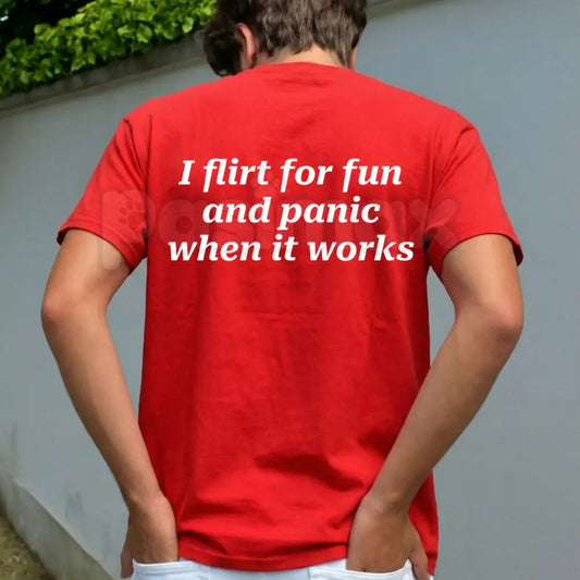 "I Flirt For Fun And Panic When It Works" T-Shirt - Funny Relatable Social Anxiety Graphic Tee, Sarcastic Dating Humor Shirt, Premium Heavyweight Unisex Statement Top, Introvert Humor Gift Apparel, Aesthetic Slogan Streetwear