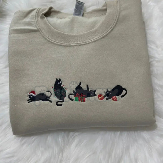 Black Christmas Cats Embroidered Sweatshirt – Cozy Holiday Cat Mom Crewneck