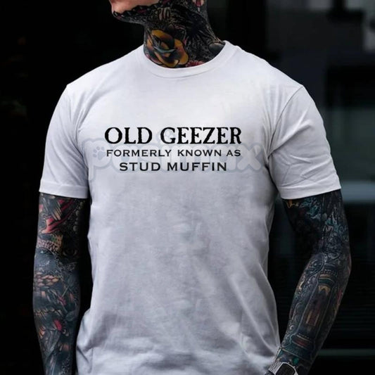 "Old Geezer Formerly Known As Stud Muffin" T-Shirt - Funny Old Man Slogan Tee, Sarcastic Aging Humor Gift, Unisex Vintage Style Apparel