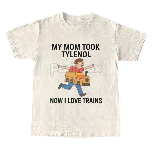 "My Mom Took Tylenol Now I Love Trains" Funny Meme T-Shirt - Absurdist Internet Humor Tee, Unisex Nonsense Slogan Apparel, Niche Culture Gift