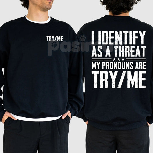 I Identify As A Threat Sweatshirt – "My Pronouns Are Try Me" Humorous Statement Top