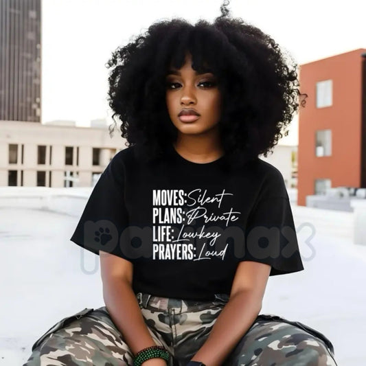 "Moves, Plans, Life, Prayers" T-Shirt - Modern Christian Lifestyle Tee, Faith-Based Goal Setter Shirt, Inspirational Daily Prayer Graphic Tee