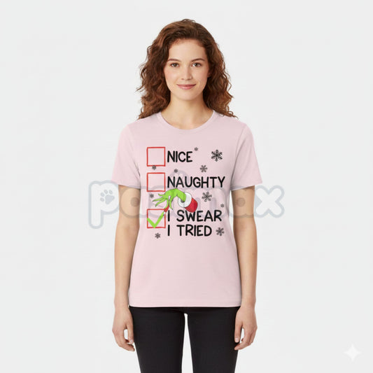 Groovy Naughty "I Swear I Tried" Christmas Holiday Unisex Tee - Funny Self-Aware Slogan Shirt, Retro Christmas Humor Apparel, Unisex Holiday Gift