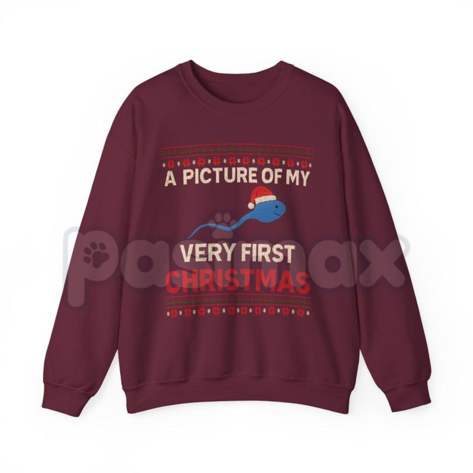 The design features a stylized, vintage-inspired photograph (or a graphic designed to look like a heavily cropped, slightly faded baby photo) labeled with the phrase "A Picture Of My Very First Christmas." The aesthetic is warm, nostalgic, and subtly humorous, focusing on the sentimentality of classic family holidays. This design is printed on a comfortable, high-quality Heavy Blend™ fabric, offering maximum warmth and cozy appeal.