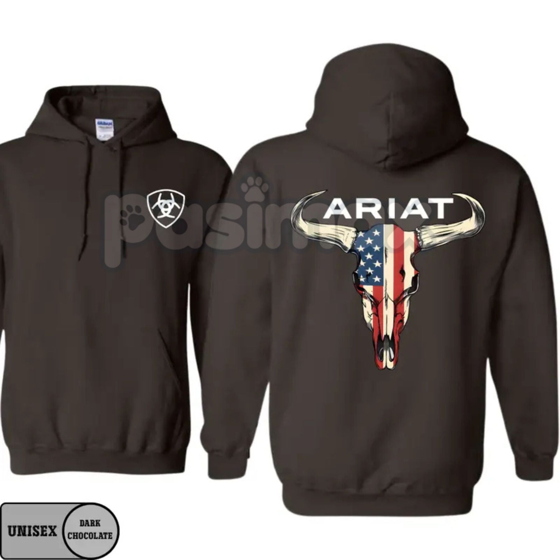 🇺🇸 🤠 Grit. Glory. Ariat Style. Showcase your patriotic spirit and Western toughness with the Ariat Hoodie! This striking pullover features an impressive graphic combining the rugged look of a Bull Skull with the bold design of the American Flag. It's the perfect fusion of iconic Ariat brand style, rustic Western Cowboy appeal, and deep national pride. This hoodie is essential wear for anyone involved in ranch life, rodeos, or the outdoor lifestyle.