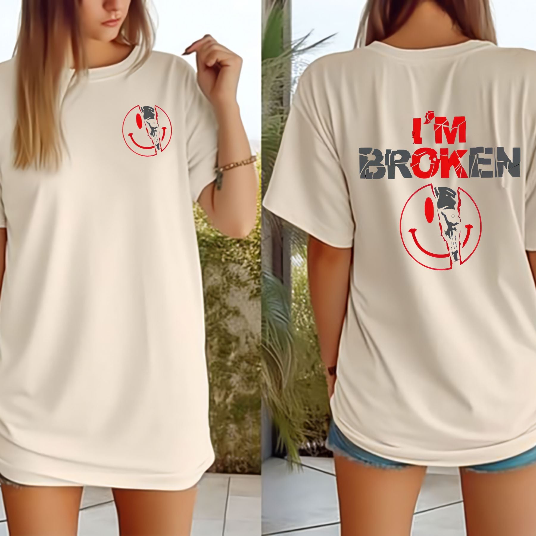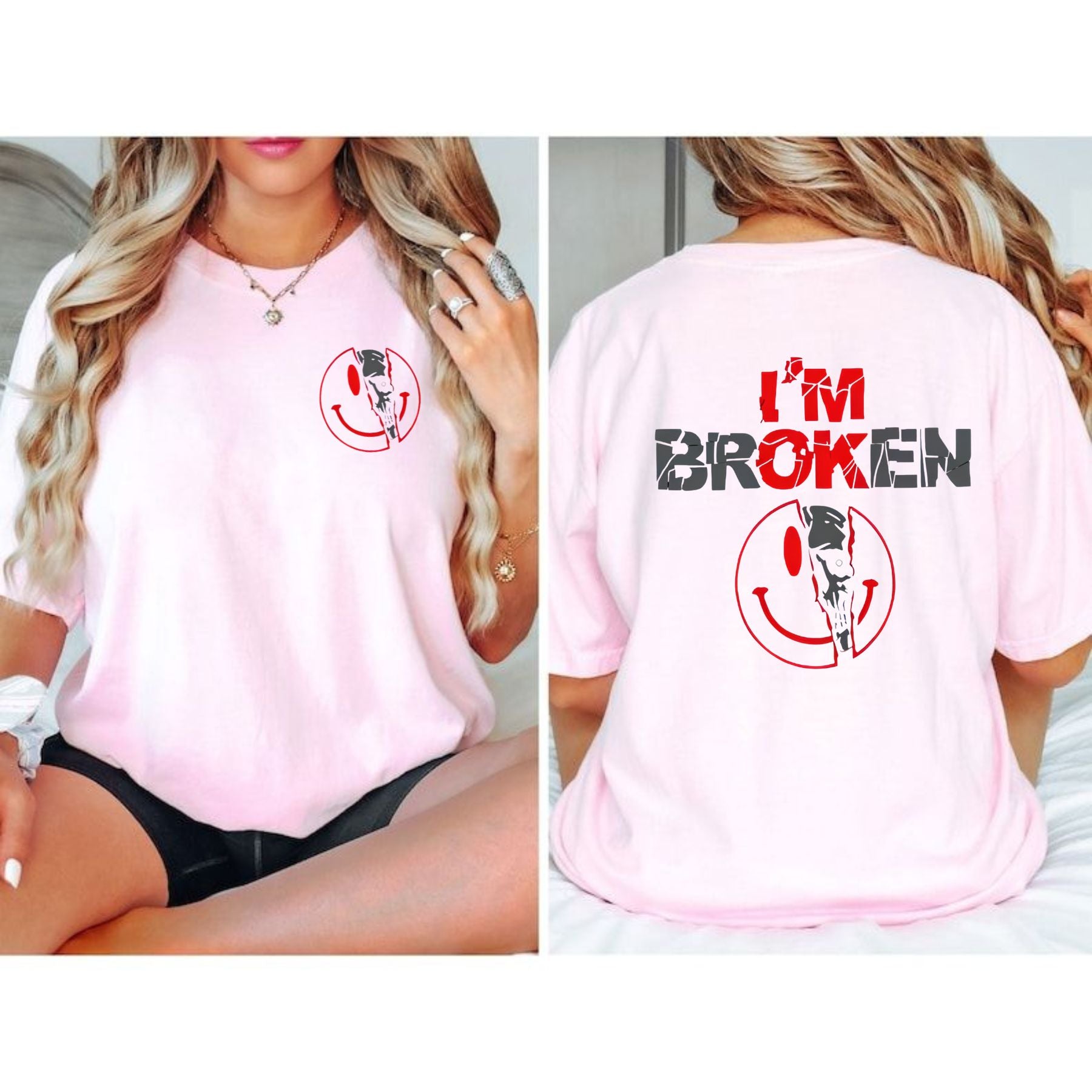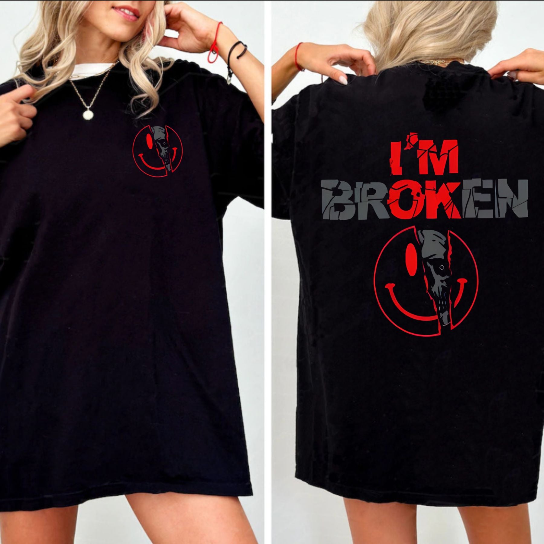 This 2-Sided "I'm Broken" Shirt is a powerful statement piece. On the front, a deceptive horror smile face masks the truth, while the back reveals the core message: a broken heart. This design is a perfect blend of dark humor and emotional depth, making it an ideal expression of personal struggle and resilience. Available as a unisex shirt or a cozy unisex sweater pullover, it’s a versatile piece of womenswear tops and a perfect gift for anyone who appreciates edgy, meaningful art.