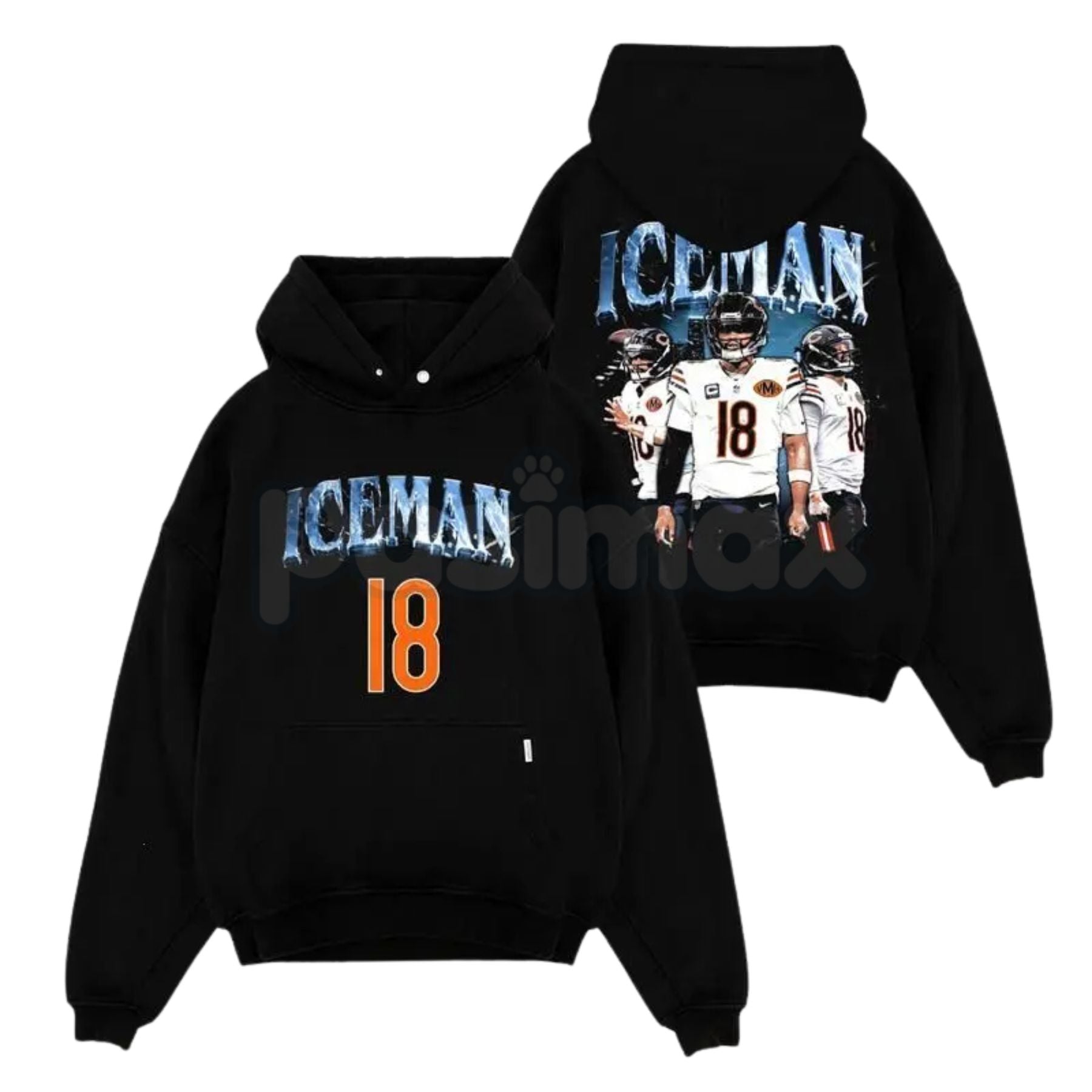 Featuring a sleek "Iceman" graphic and his signature #18, this collection (Hoodie, Sweatshirt, and T-Shirt) combines high-performance style with the grit of Chicago football.