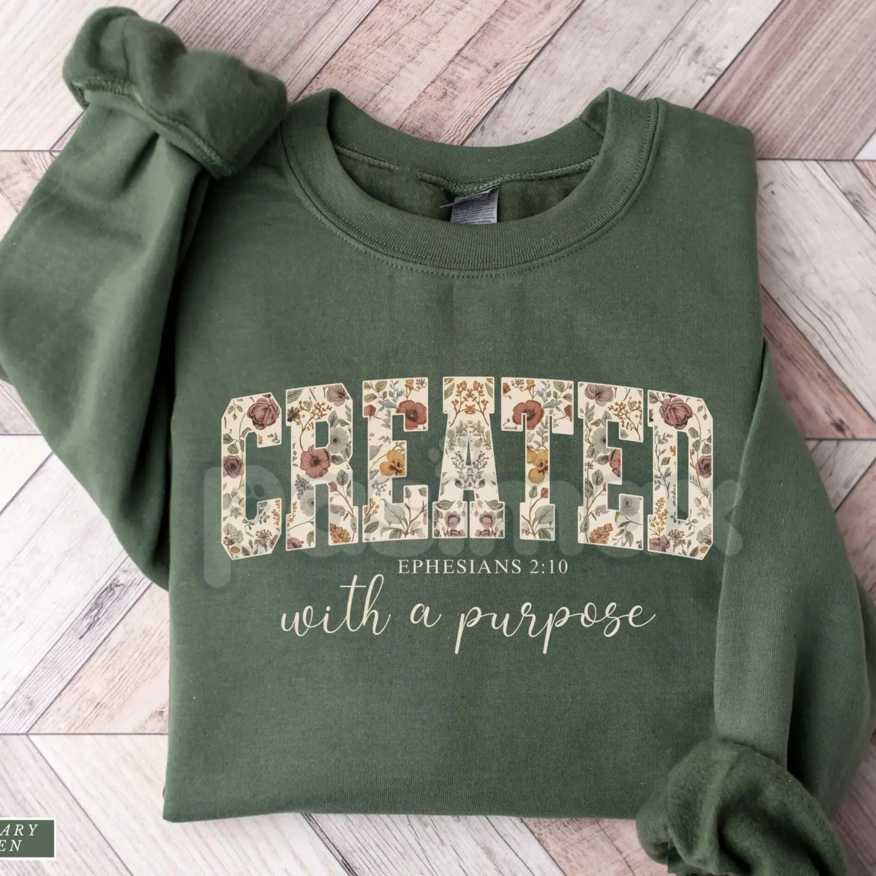 Created with a Purpose Floral Sweatshirt | Inspirational Affirmation Jumper | Motivational Flower Graphic Crewneck | Christian Faith Gift