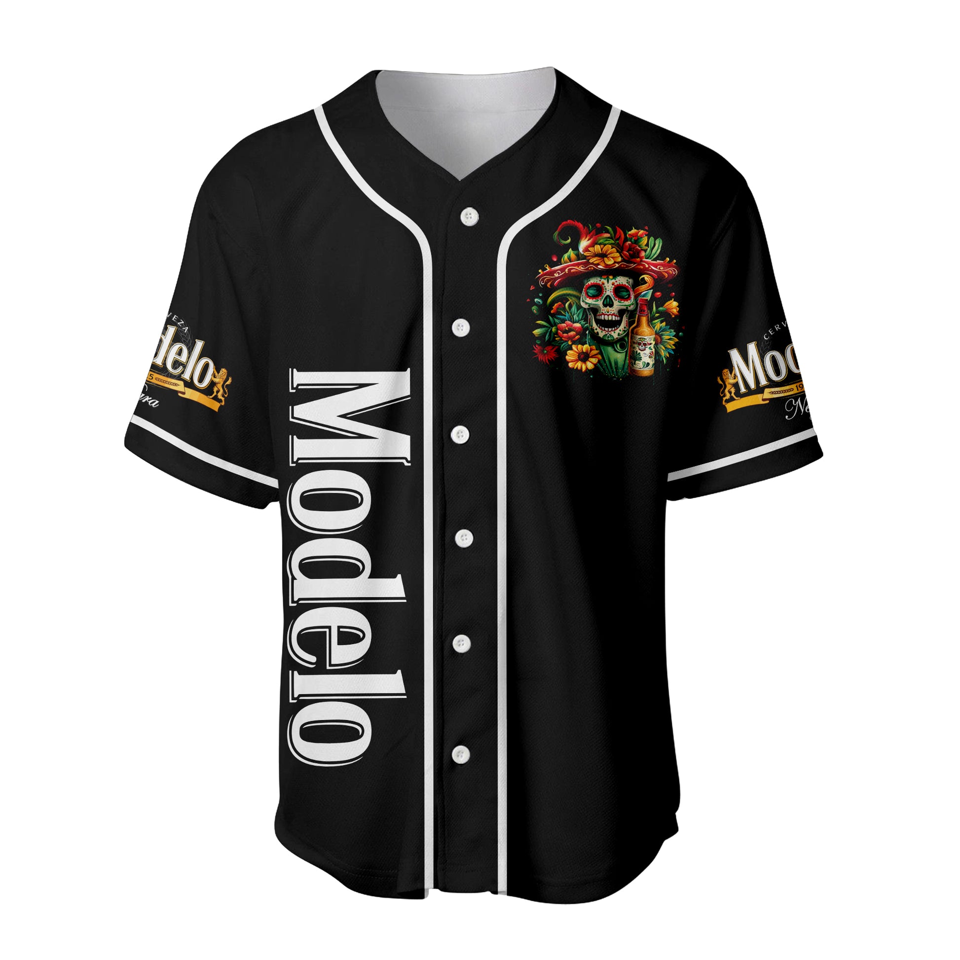 This isn't just a jersey—it's a tribute to a timeless tradition. Our Día de los Muertos Baseball Jersey features a powerful, intricate skull design on an all-black Modelo Negra backdrop. This unique shirt honors the celebration of life and memory with a style that is both striking and deeply meaningful.