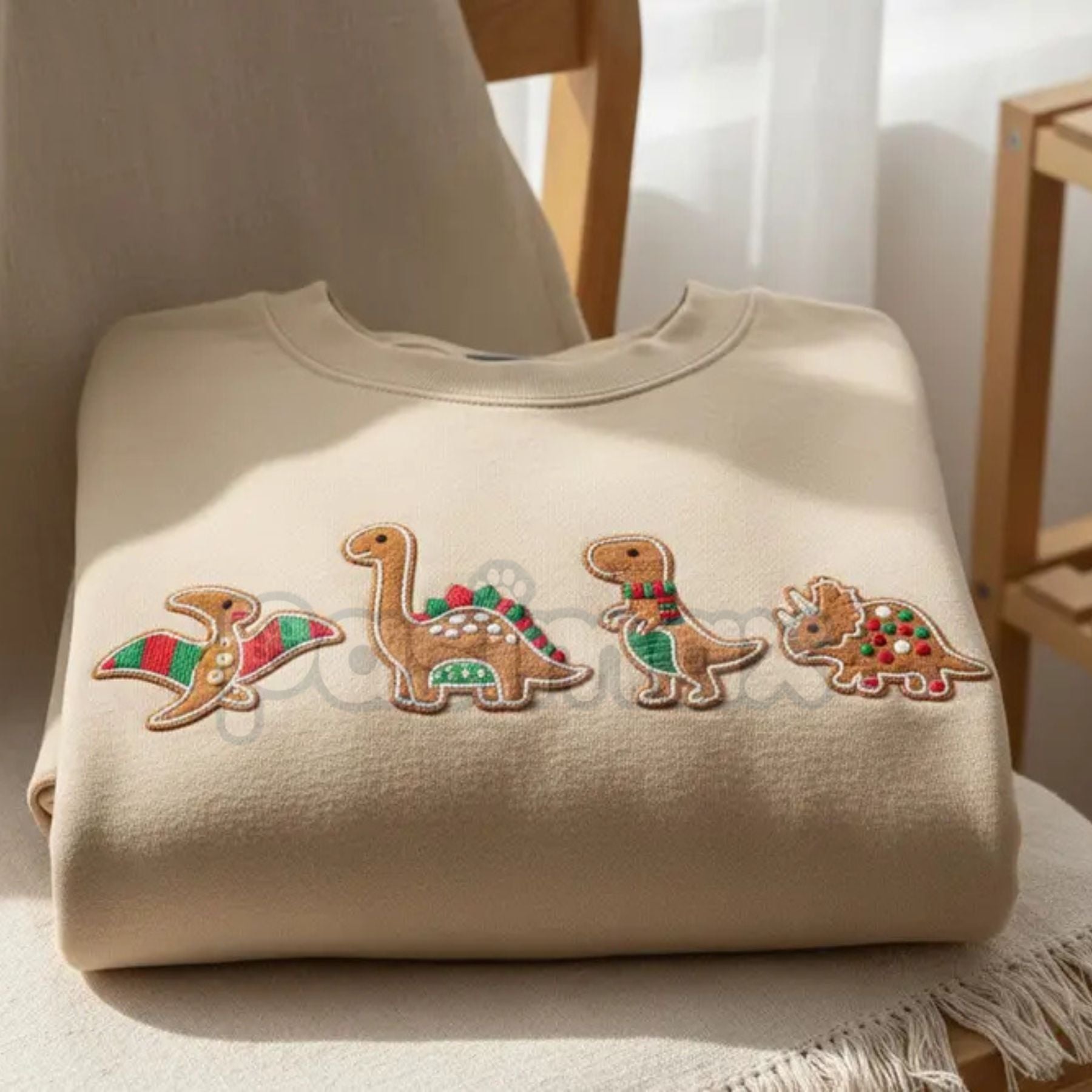 Gingerbread Dinosaur Christmas Embroidered Sweatshirt – Funny Holiday Crewneck