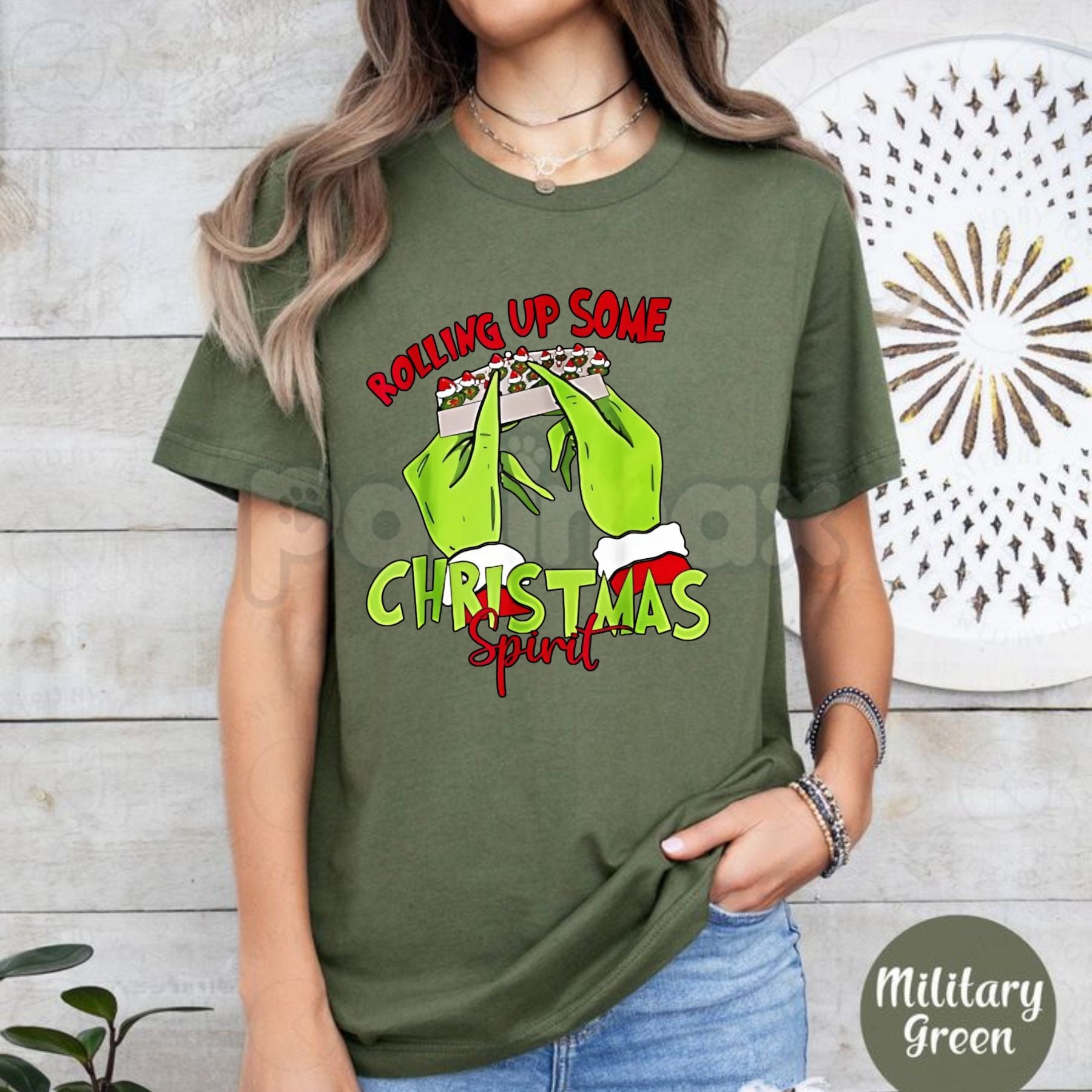 Christmas Spirit Grinch Hands Rolling Joint T-Shirt - Funny 420 Holiday Party Wear, Adult Grinch Christmas Gift, Edgy Festive Apparel