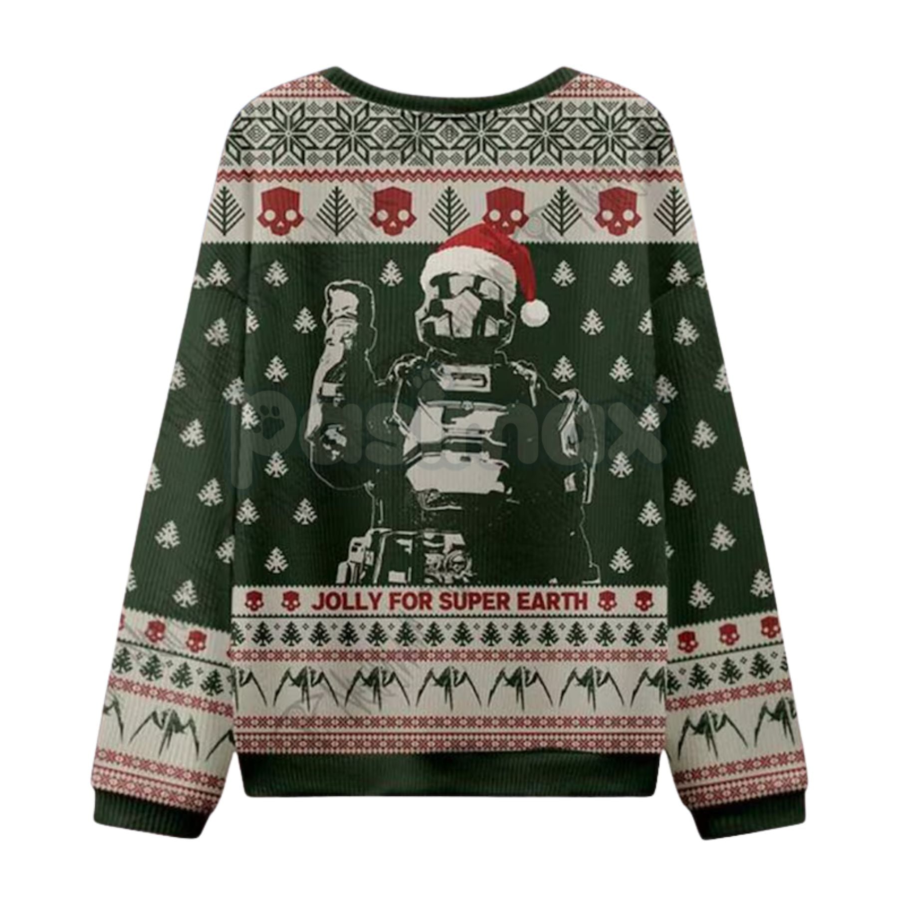 • Gaming Fandom Graphic: Features an Ugly Christmas Sweater pattern built around Helldivers 2 elements and the "Jolly for Super Earth" slogan.