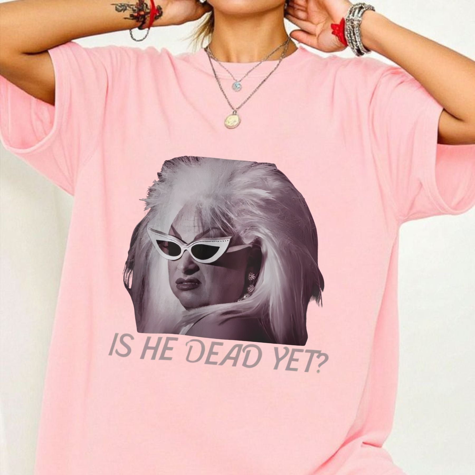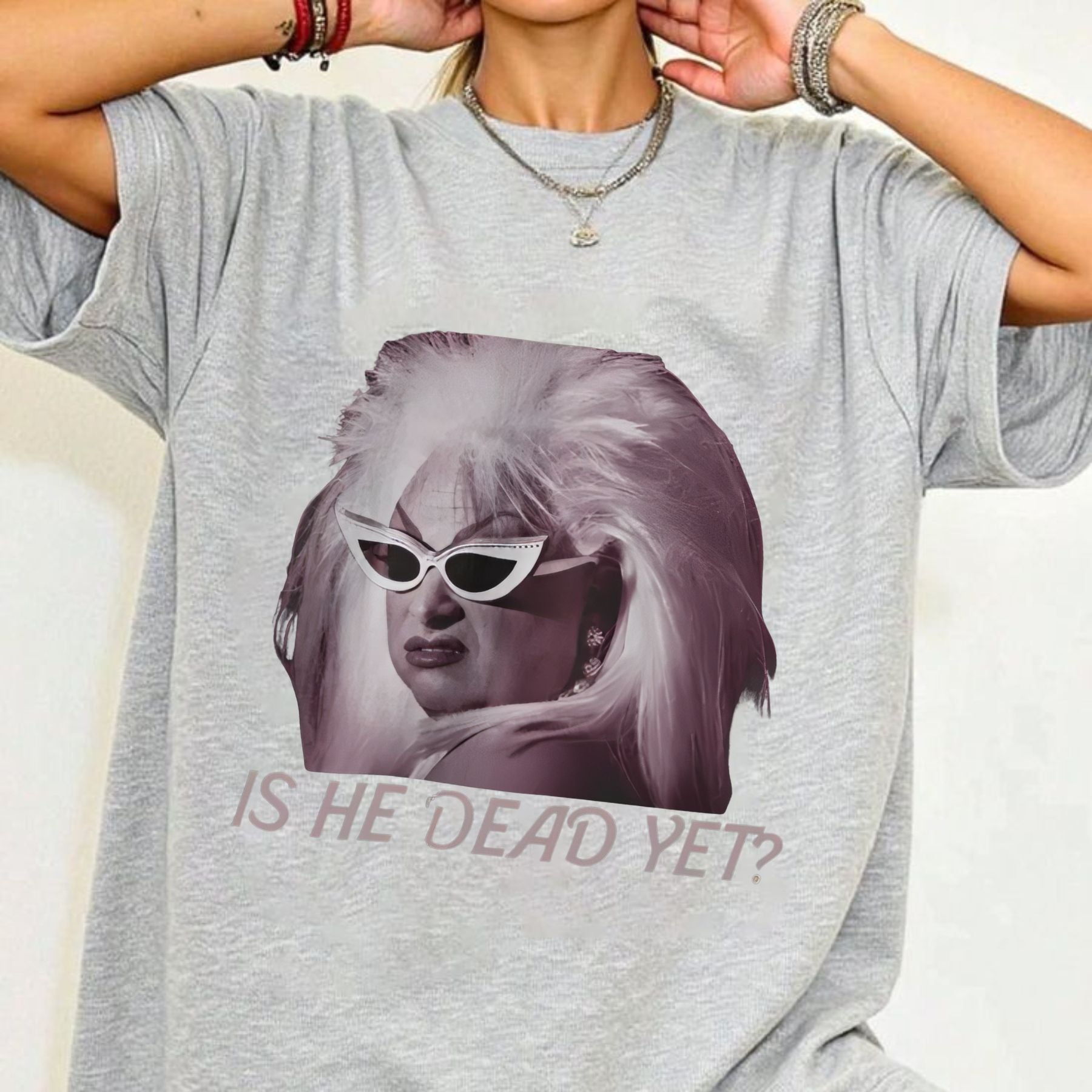 This "Is he dead?" printed vintage fashion T-shirt is for those who appreciate humor on the darker side of life. With its bold, simple quote, this universal casual cotton tee is a unique and edgy addition to any wardrobe. Made with a comfortable fabric, this women's fashion top is a standout piece of streetwear that's both stylish and funny. It's an effortless conversation starter that's guaranteed to get a reaction.