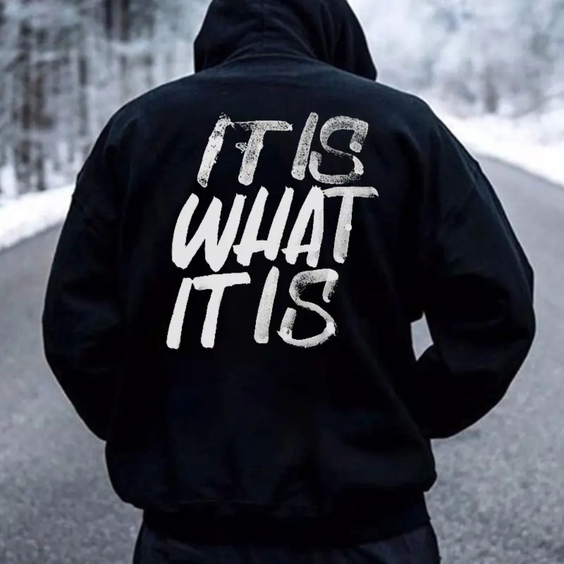 "It Is What It Is" Distressed Print Hoodie – Basic Men’s Casual Pullover, Laid-Back Vibe Streetwear