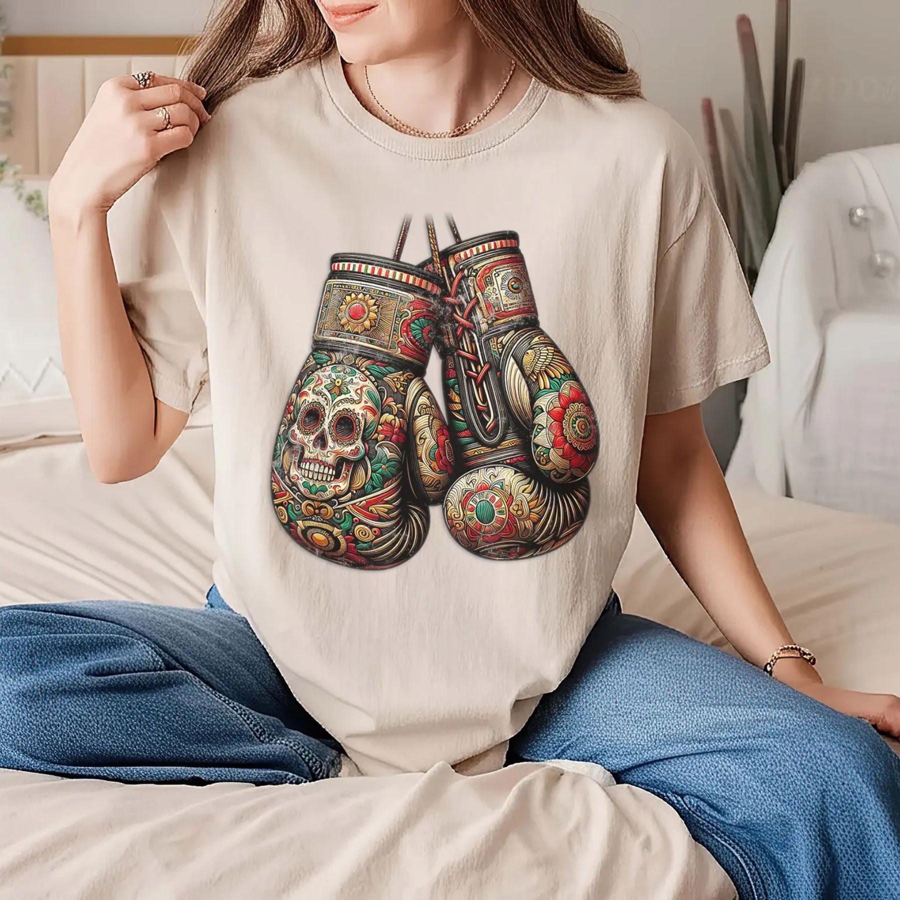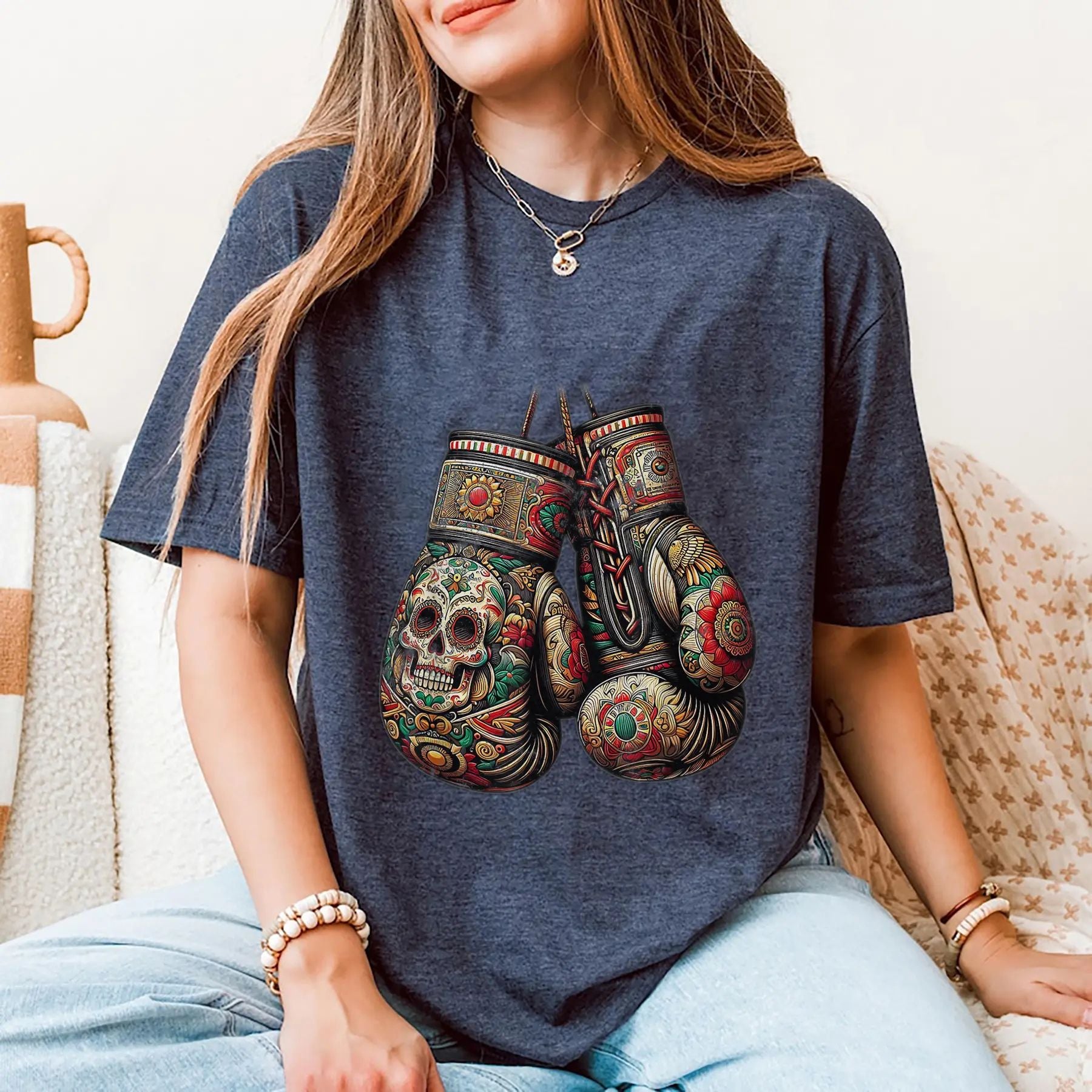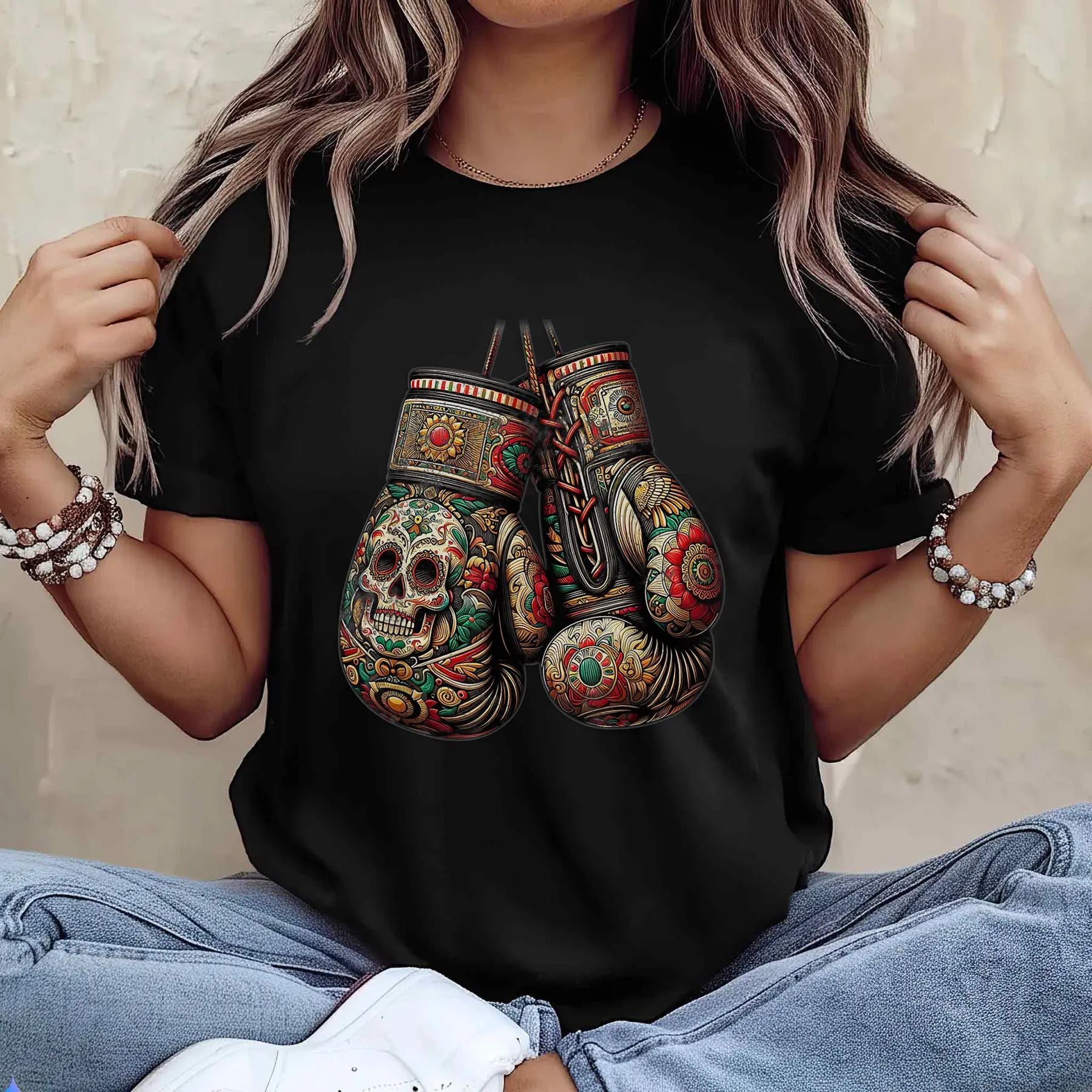 This Aztec Mayan Fighter T-shirt is a striking tribute to Mexico's rich cultural and fighting heritage. The vintage graphic of the boxing gloves with intricate Aztec and Mayan patterns makes this more than just an outfit—it's a wearable piece of art. Perfect for boxing fans and anyone who wants to celebrate the powerful history behind the sport.