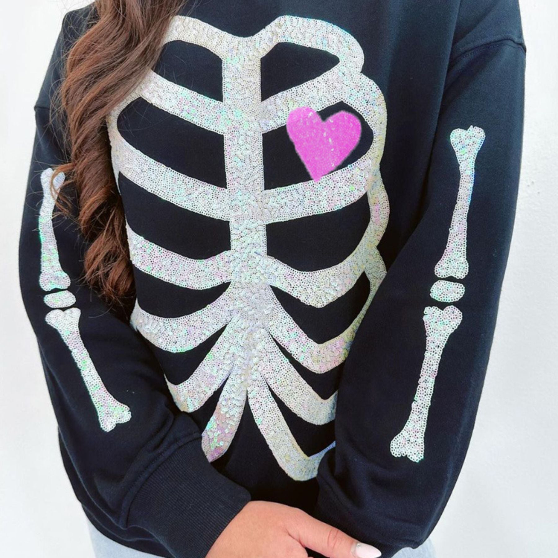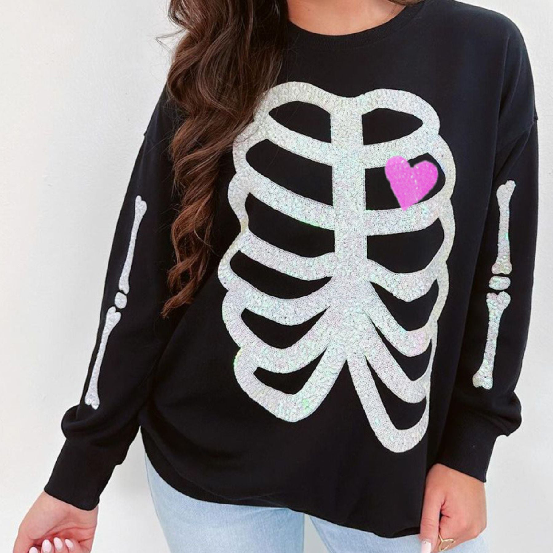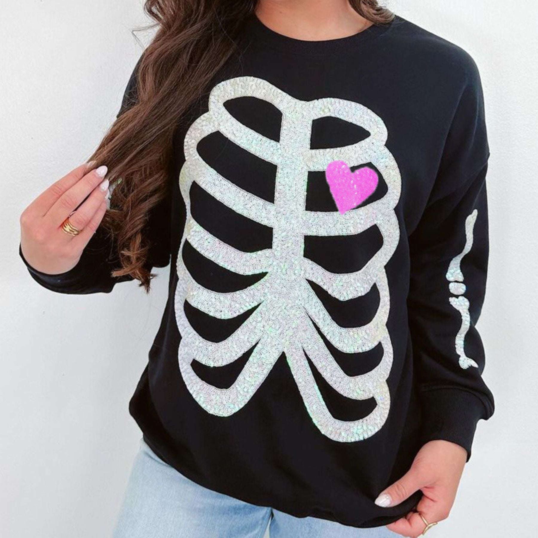 Sequin Skeleton Halloween Sweatshirt for Women – Spooky Casual Crew Neck Pullover, Long Sleeve Fall Streetwear