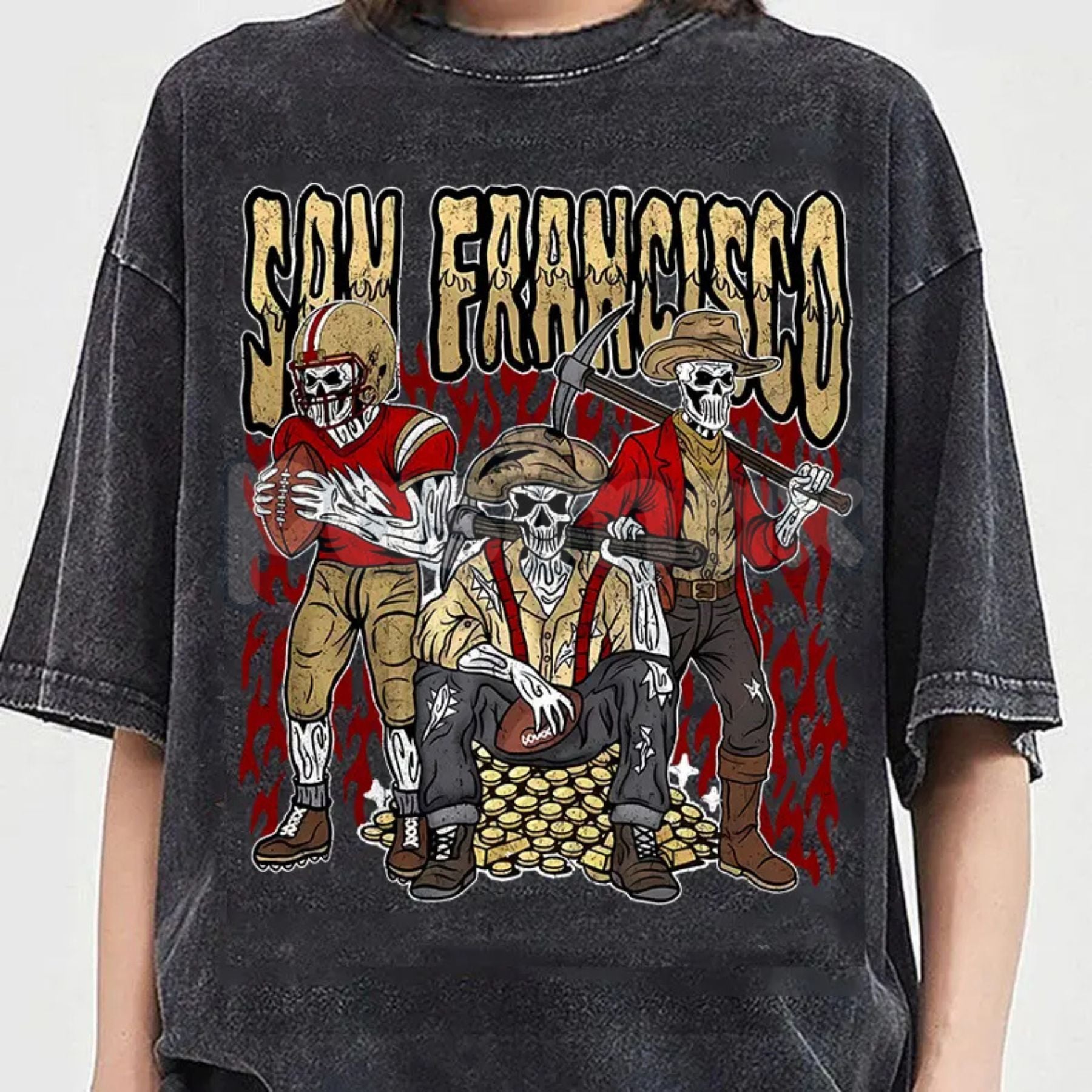 Show your unwavering team pride with our Teams Football Skull Vintage Washed T-Shirt. This "Pepper" style washed tee is a fierce, retro tribute to classic 90s football apparel. Featuring a bold, skull-themed graphic that cleverly represents the intensity of game day and the enduring spirit of all your favorite teams (especially that iconic Dallas team!), this shirt is a must-have for every die-hard fan. It's the perfect top for tailgates, watching the game, or bringing a nostalgic, edgy style to your everyday wear.