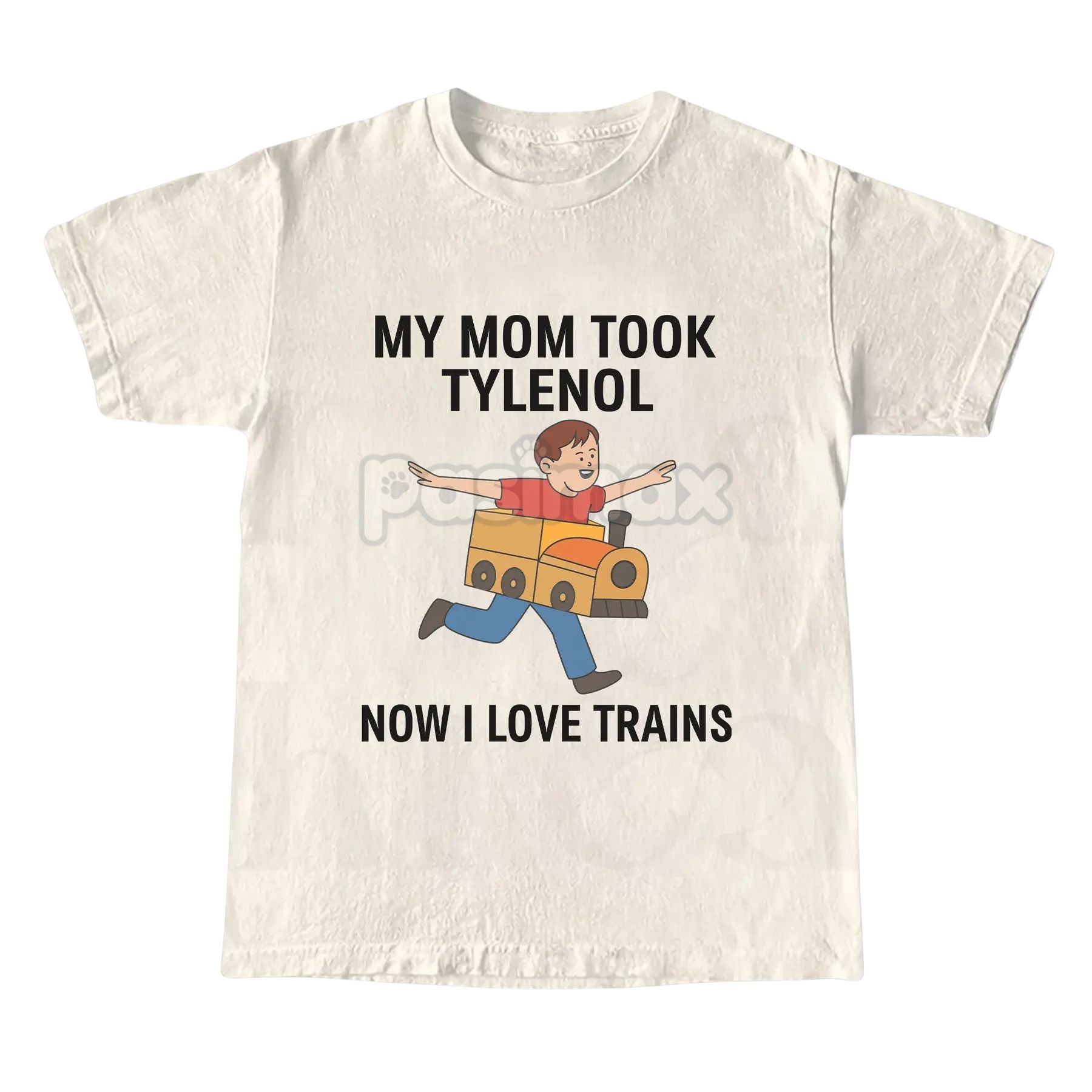 "My Mom Took Tylenol Now I Love Trains" Funny Meme T-Shirt - Absurdist Internet Humor Tee, Unisex Nonsense Slogan Apparel, Niche Culture Gift