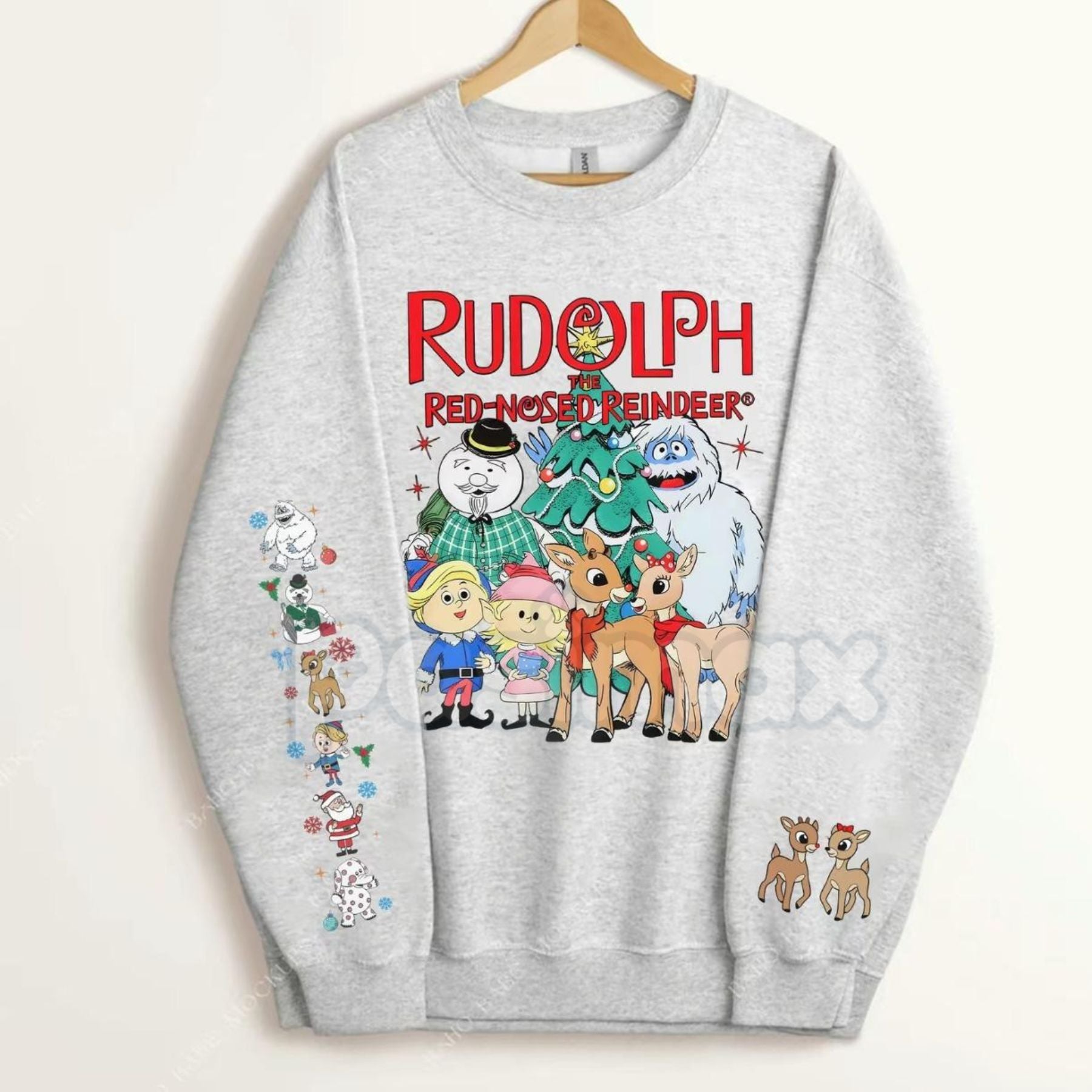 Rudolph Red Nosed Reindeer Sweatshirt with Sleeve Design | Nostalgic Christmas Jumper | Holiday Detail Crewneck