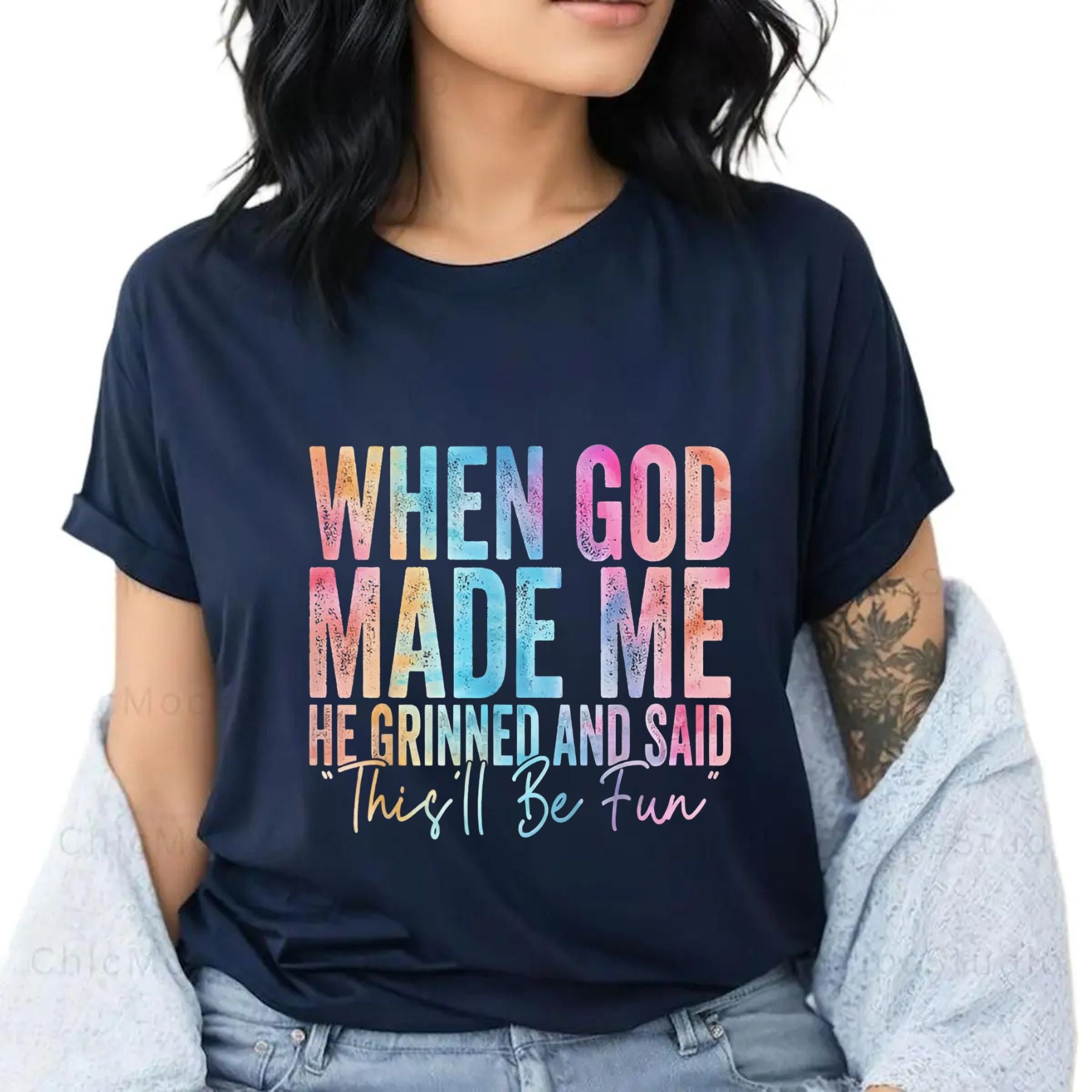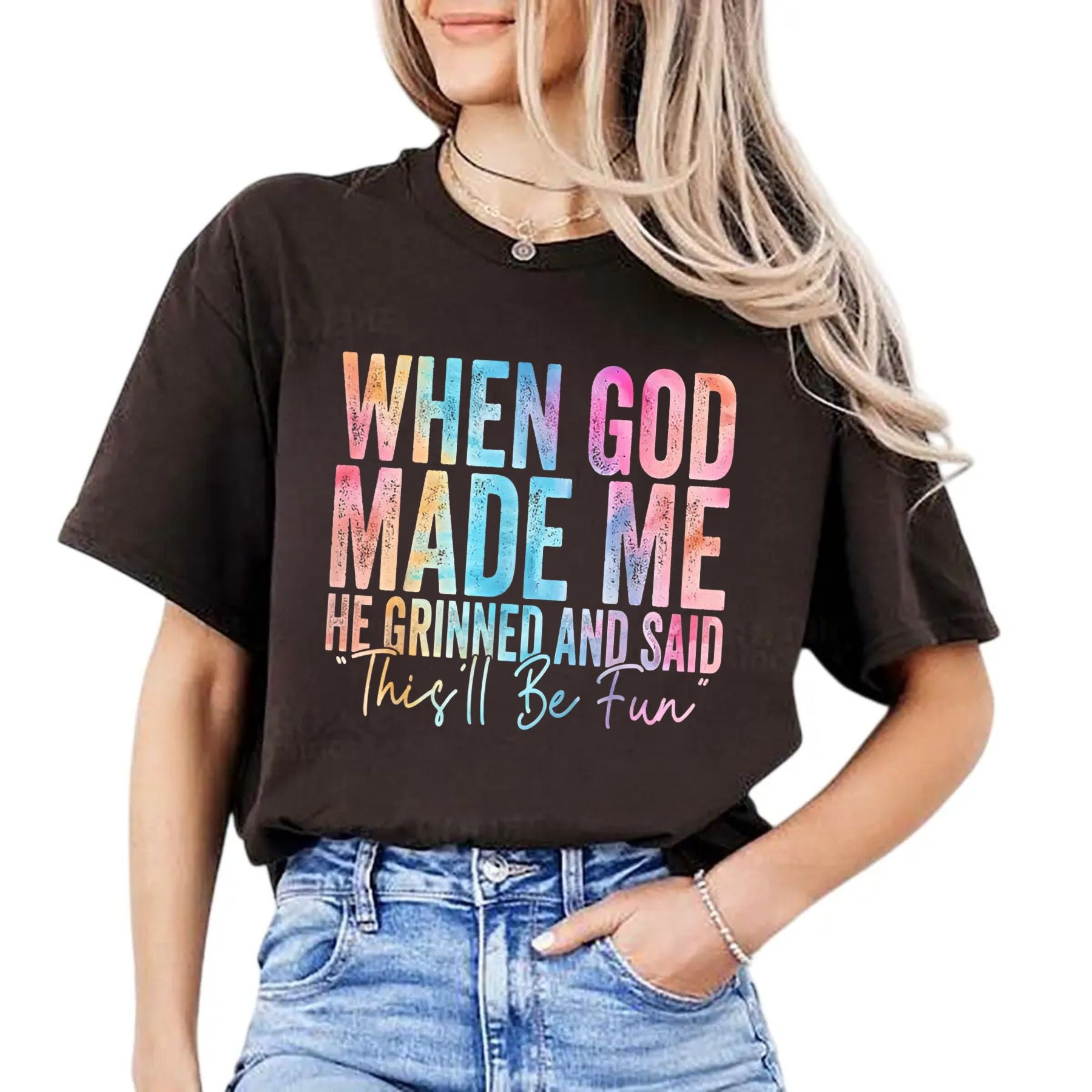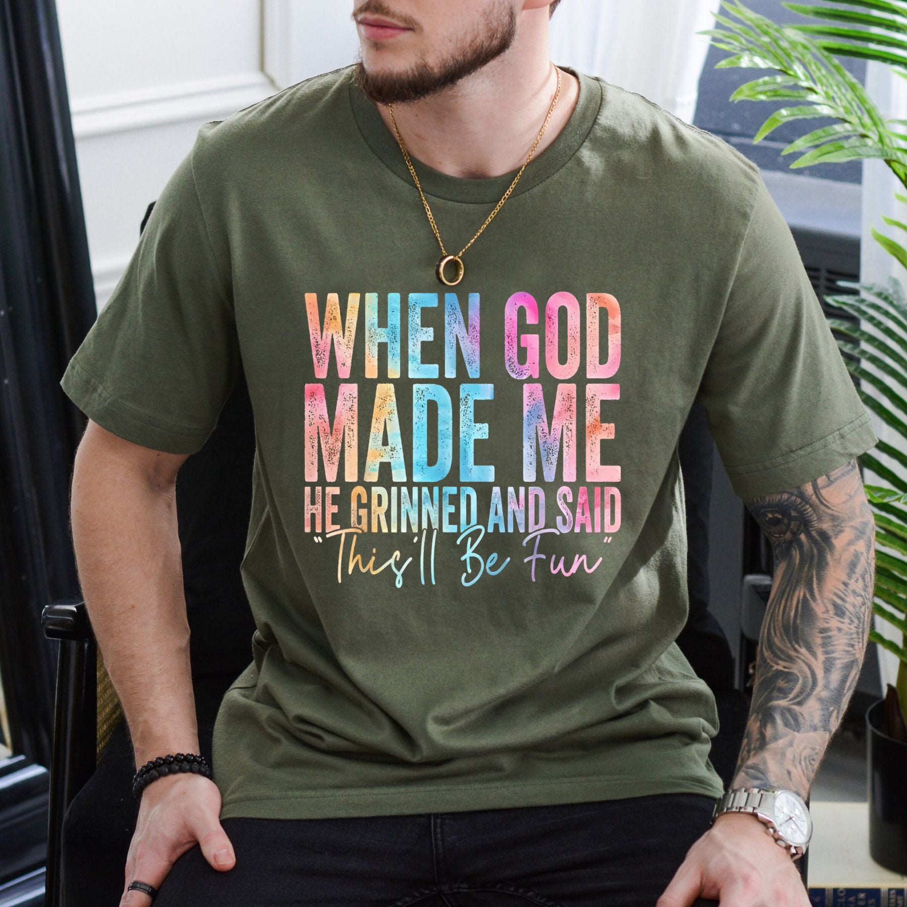 This "When God Made Me He Grinned" T-shirt is the perfect way to wear your personality on your sleeve. The funny, sarcastic saying is a confident nod to your unique charm. It’s an ideal sarcastic quote tee for anyone who is a little extra, a bit of a troublemaker, or simply a masterpiece in the making. Wear this shirt to a party, a casual day out, or just to make your friends laugh.