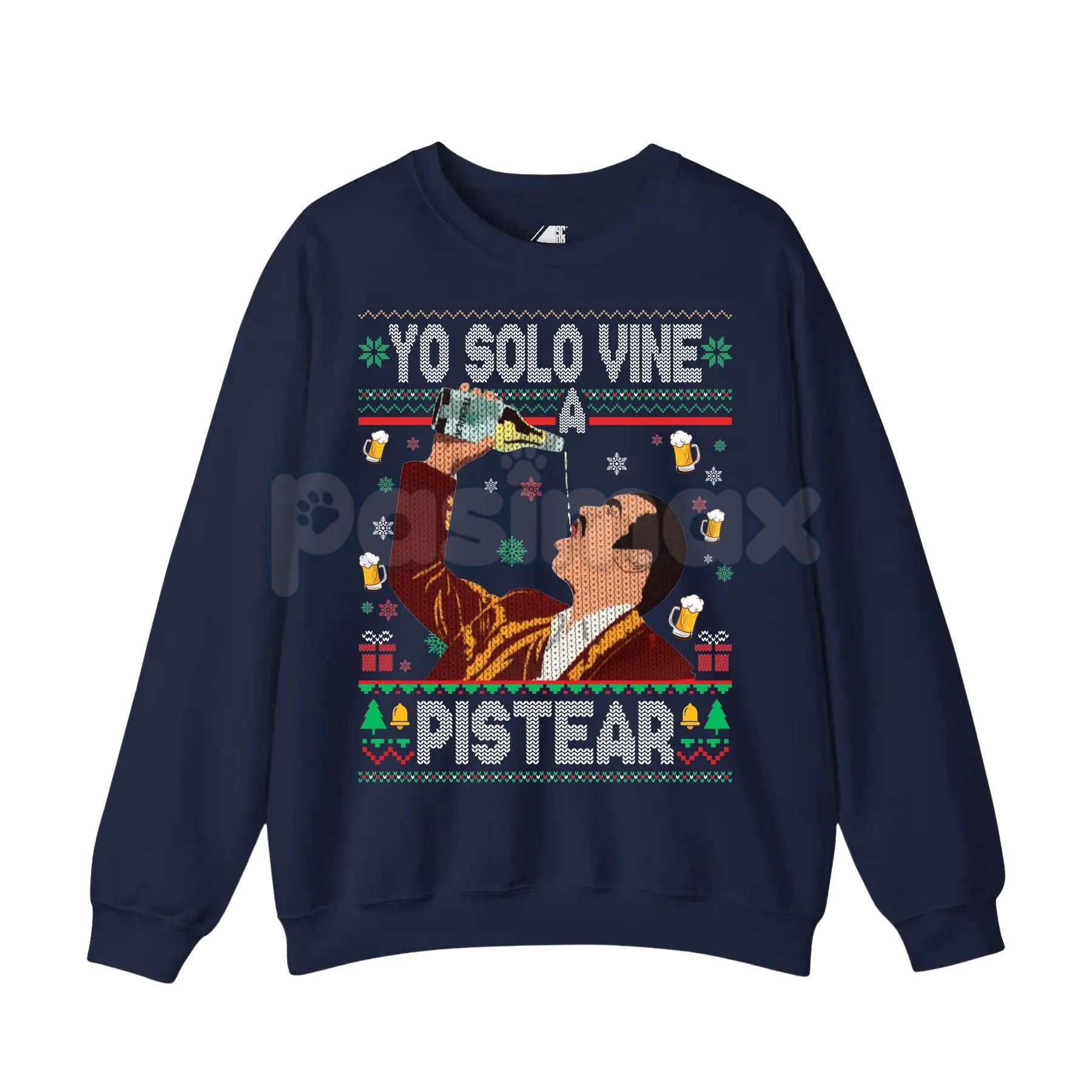 • Design Theme: Features the humorous Spanglish phrase "Yo Solo Vine a Pistear" (I just came to drink), styled as an ironic Ugly Christmas Sweater.